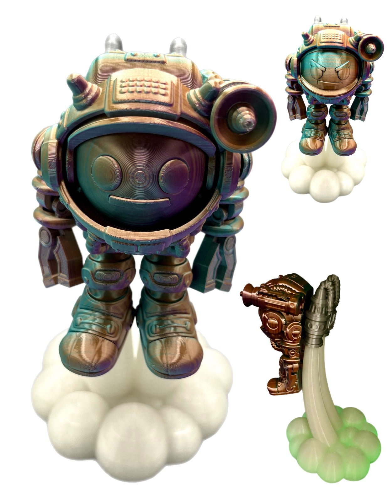This adorable, space-bound 3D-printed astronaut is equipped with a jet pack, a glow-in-the-dark smoke stack, and a retractable visor for added interactivity.