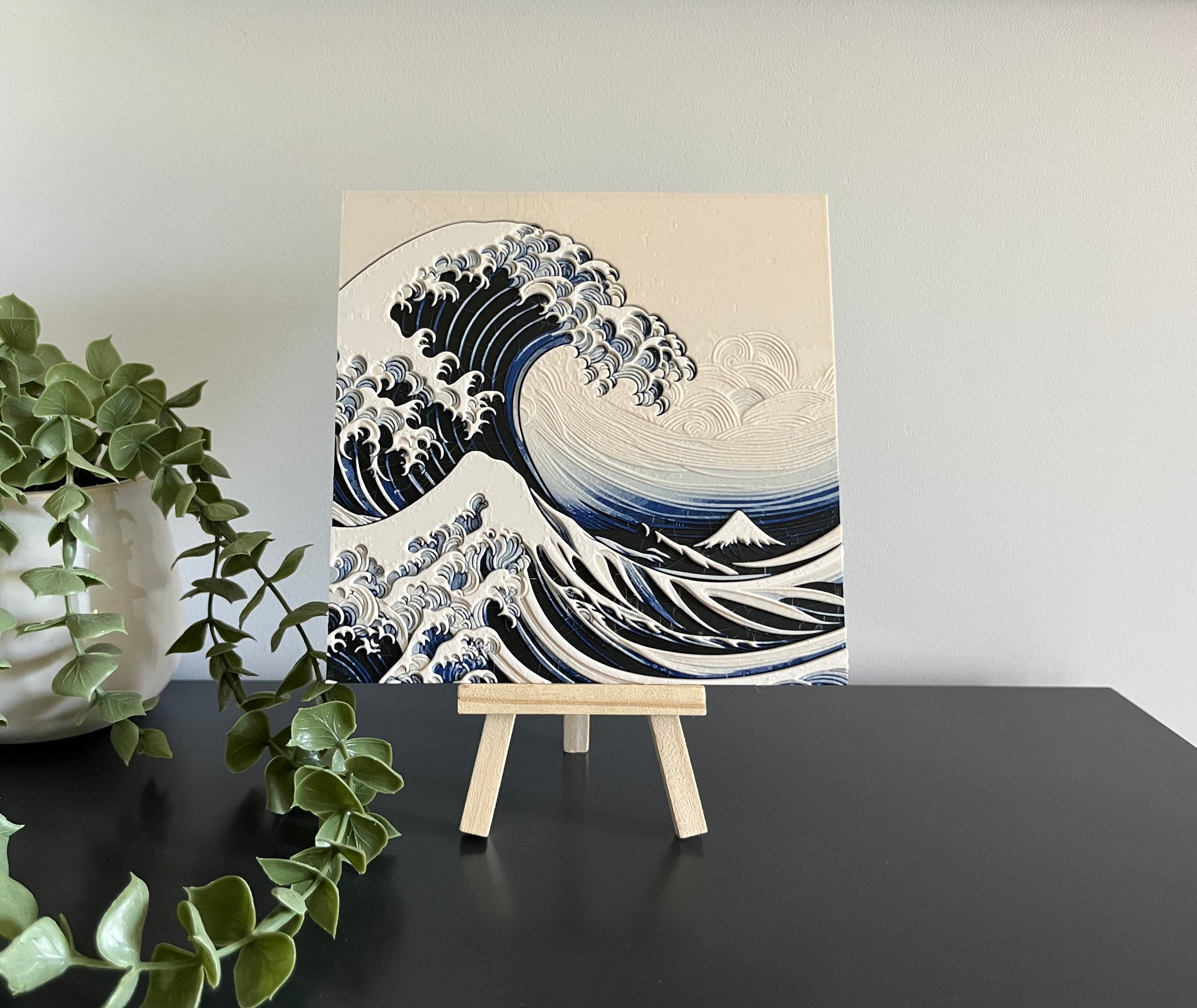 This 3D-printed Japanese wave art captures traditional wave motifs in stunning detail, with raised texture.