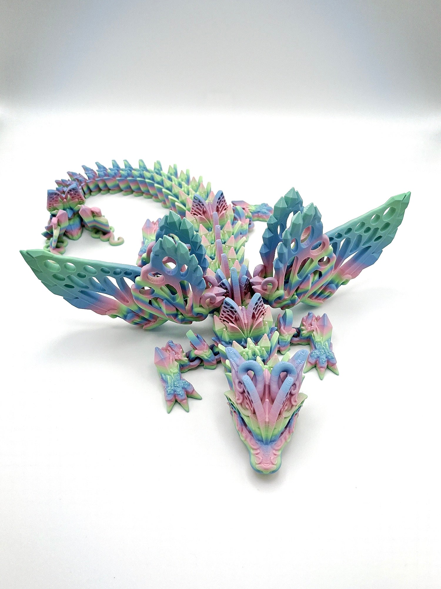 This mesmerisingly beautiful 3D-printed Wing Fae Dragon showcases elaborate wing structures and intricate artistry, bringing beauty and fantasy together in a striking display. A truly stunning dragon!